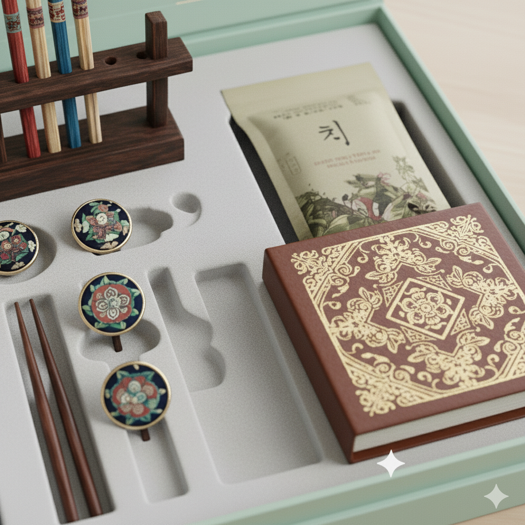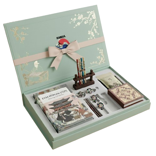 To practice writing, the kit includes a Practice Notebook πŸ“ and Calligraphy Brushes & Ink πŸ–ŒοΈ. Writing by hand helps learners memorize characters, develop fine motor skills, and connect with the traditional art of Korean calligraphy. The tactile experience makes learning fun, creative, and immersive 🎨.