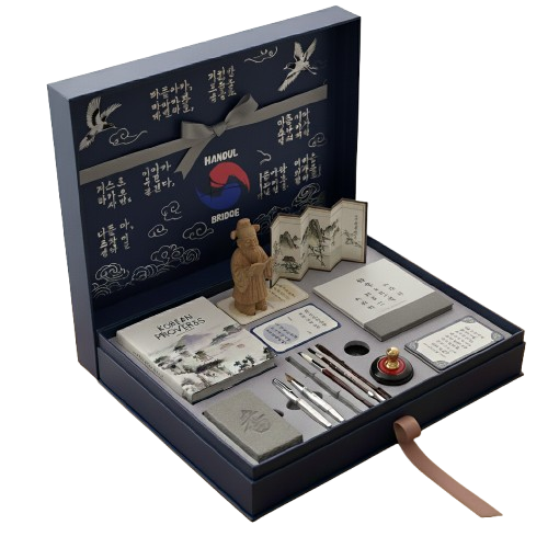 Moreover, the kit features additional cultural and interactive elements, including a stone paperweight, a wooden figurine, and a small byeongpung (traditional folding fan). These items add a playful, hands-on dimension to the learning experience, letting learners connect with Korean traditions while practicing their language skills. For example, the paperweight and figurine help organize materials and mark progress, while the byeongpung allows learners to decorate or write simple phrases, combining creativity with language practice.